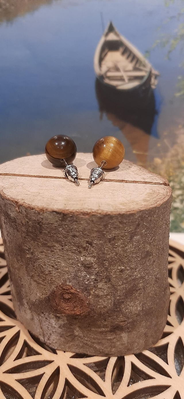 Boucles d'oreilles en pierres naturelles de œil de tigre. Perles de 10 mm. Tige et fermoir en acier.