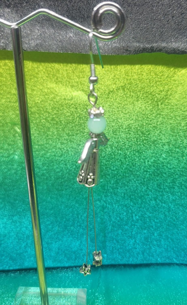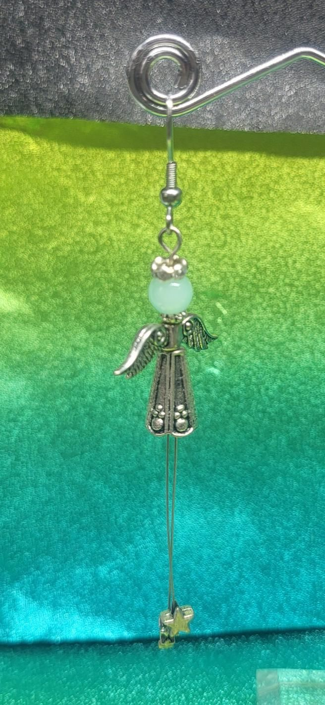 Boucles d'oreilles anges. Montées sur de acier gainé. Tête en perles de verre. Pieds étoile 🌟 auréole en strass.