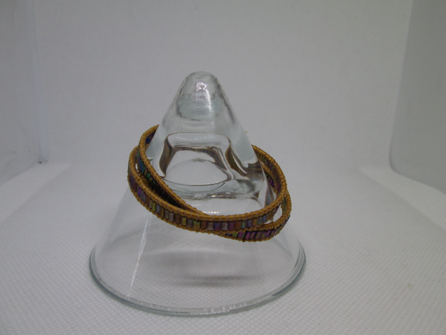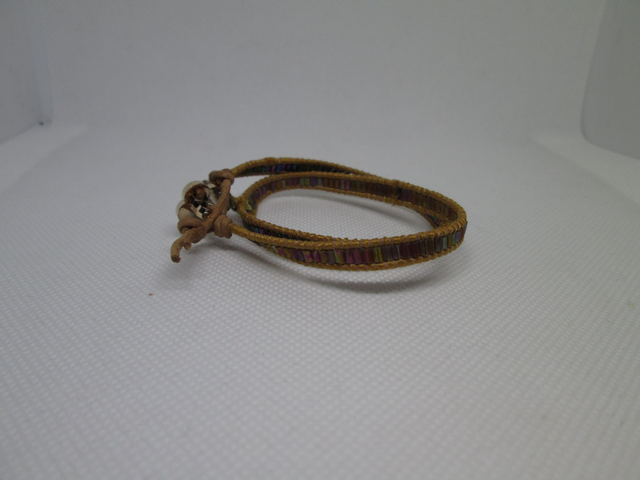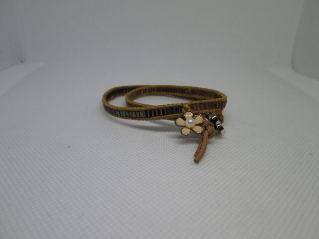 Bracelet en perles de verre chauffé montés sur lanières de cuir . fermoir avec bouton fleur émaillée. taille de poignet 16/17 cm