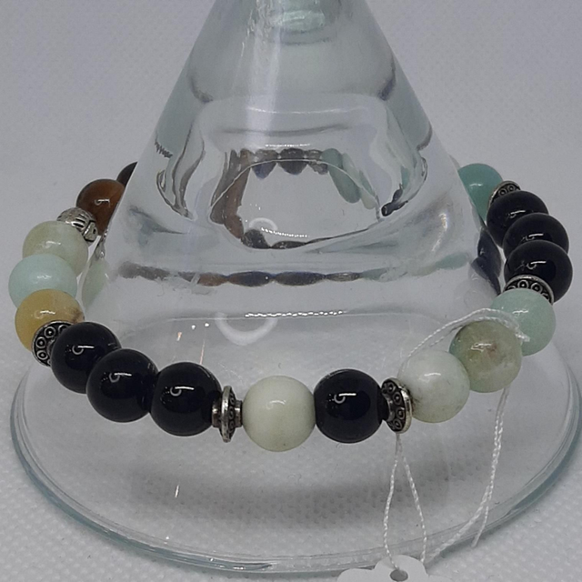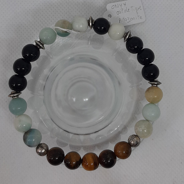 Bracelet en pierres naturelles. Perles de 8 mm en onyx, œil de tigre et amazonite. Taille de poignet 18 cm