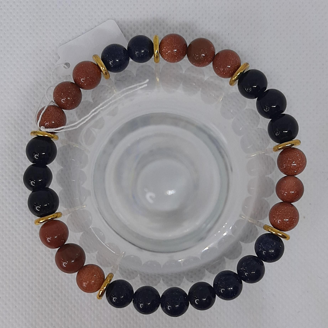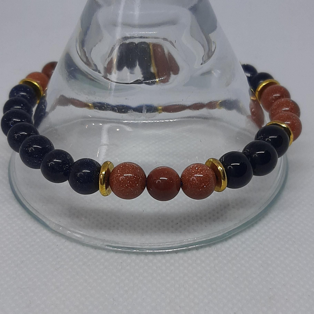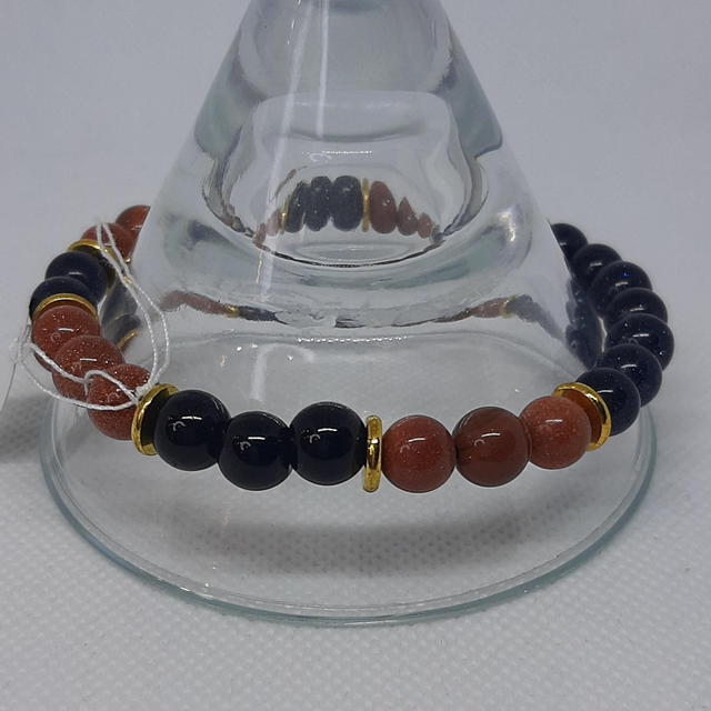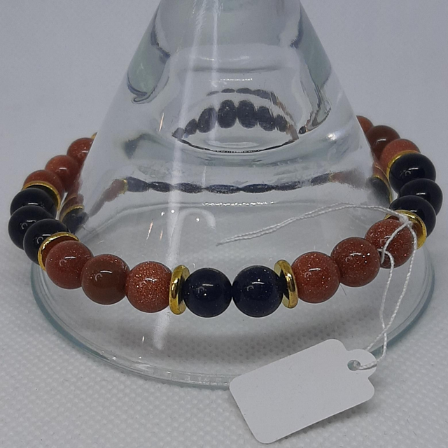 Bracelet en pierres naturelles. Perles de 8 mm en pierres de soleil bleu nuit et doré et onyx. Intercalaires acier doré. Taille de poignet 20 cm.