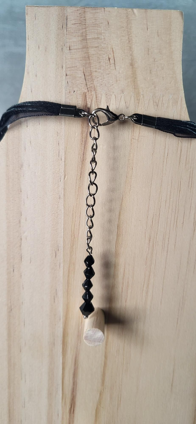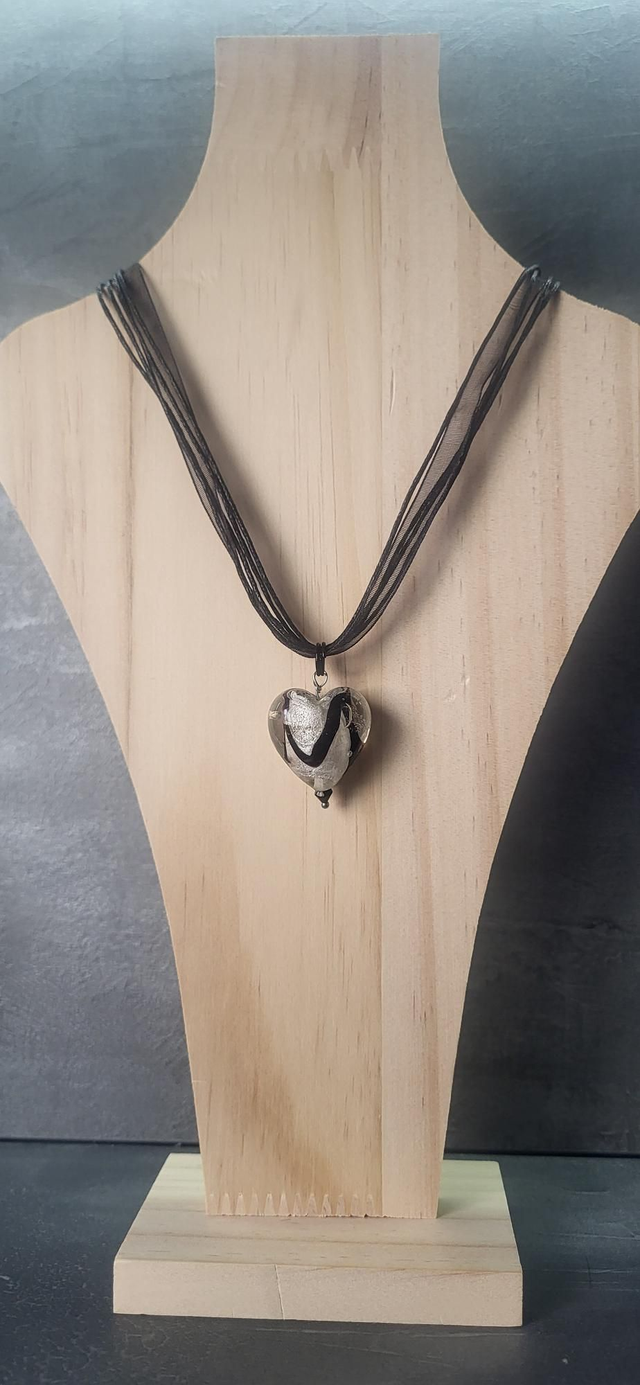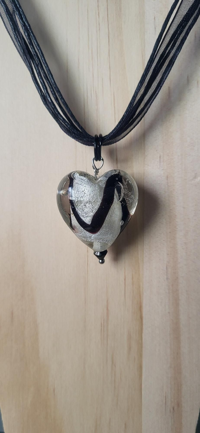 Collier en cordon et organza noir avec un pendentif en forme de cœur en verre avec inclusions.