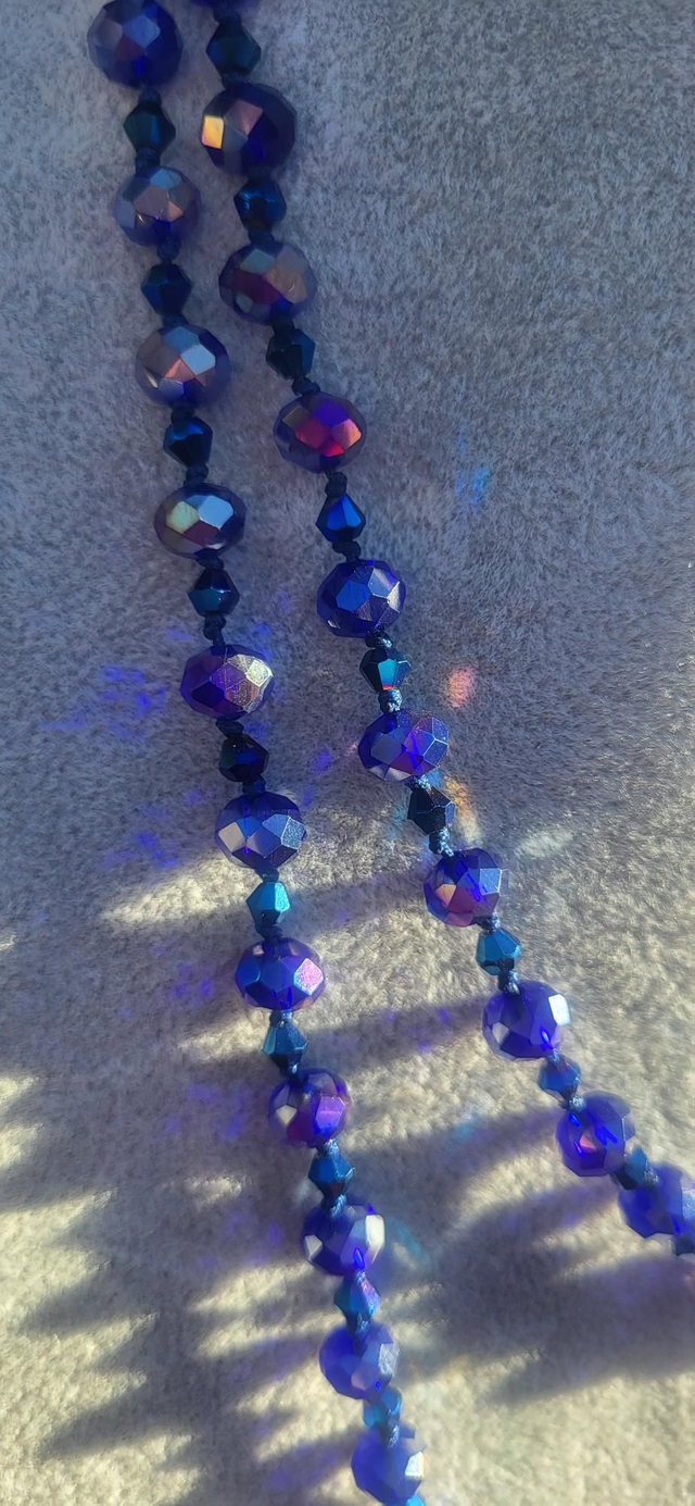 Collier sautoir en cristal autrichien bleu chauffé. D'où les reflets violet.