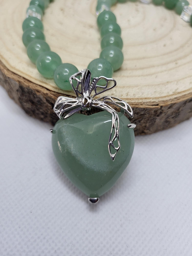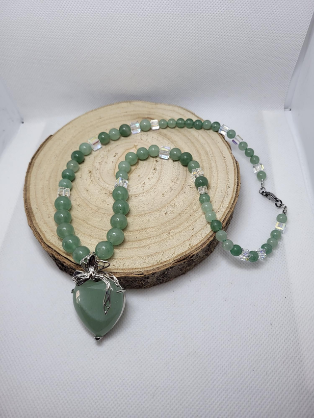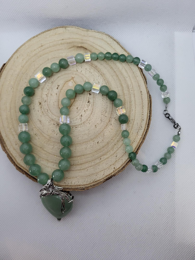 Collier en aventurine 100% pierres naturelles avec intercalaires en cristal 🔮 autrichien. Pendentif en forme de cœur en aventurine en métal argenté. Perles en 10, 8 et 6mm. Modèle unique