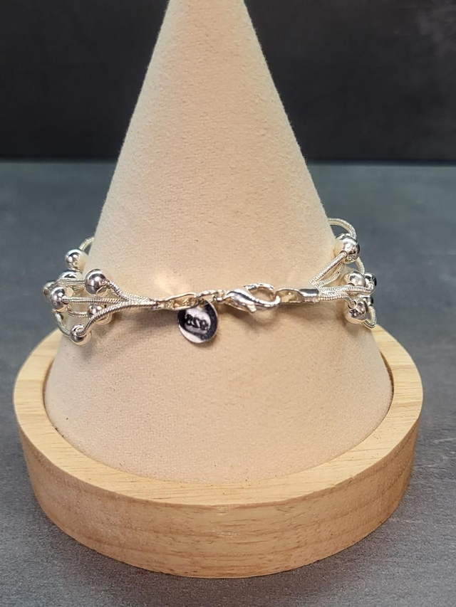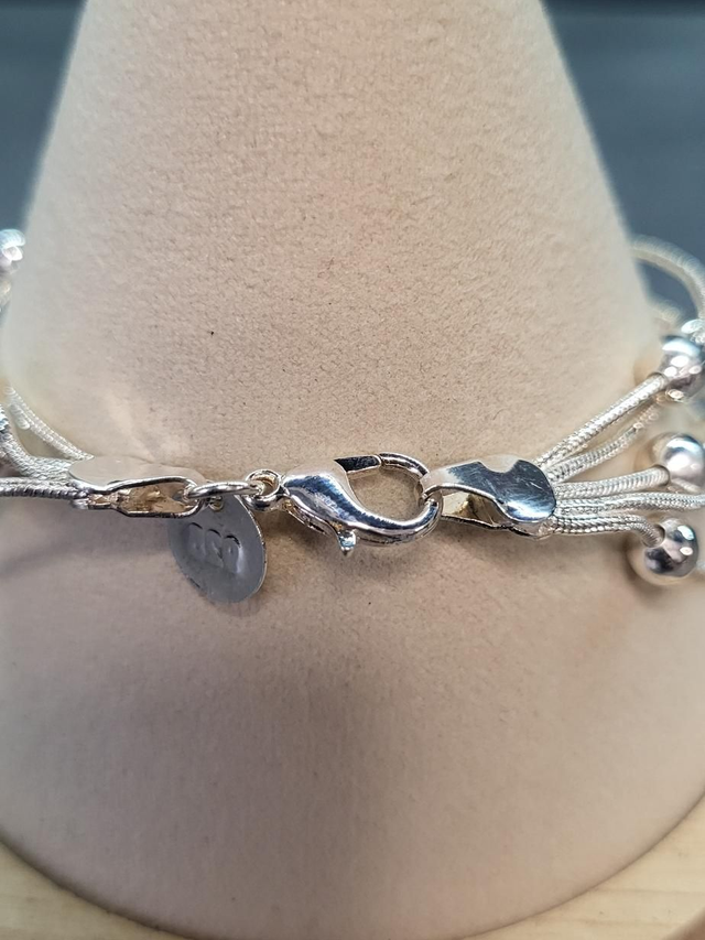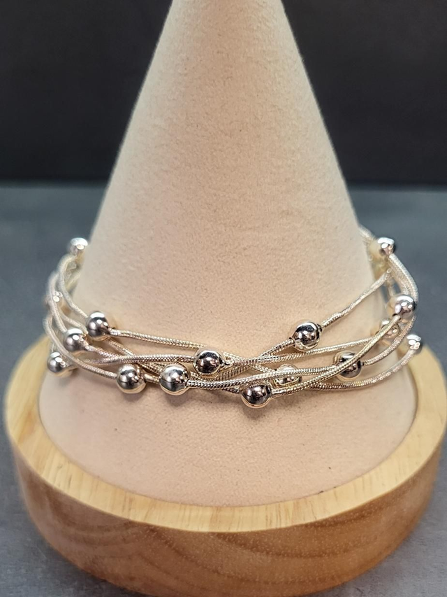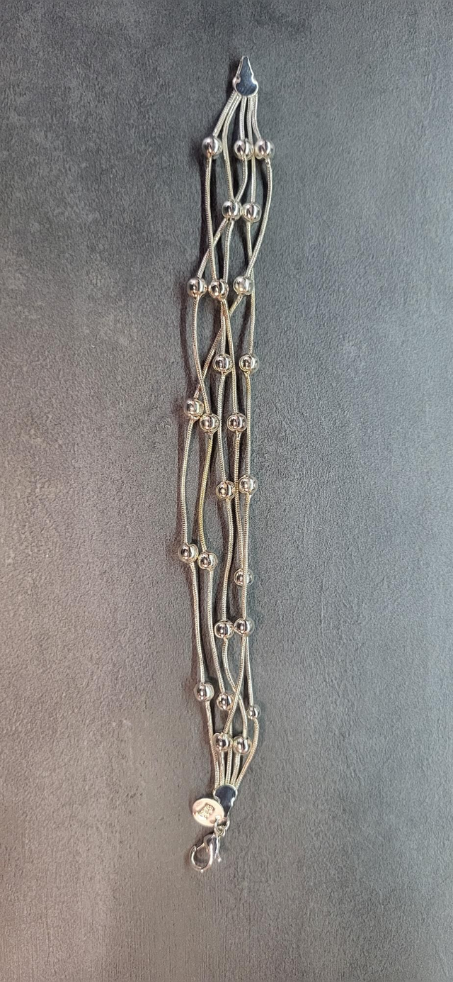 Montée de 5 chaînes fines avec petites boules brillantes.