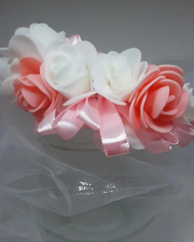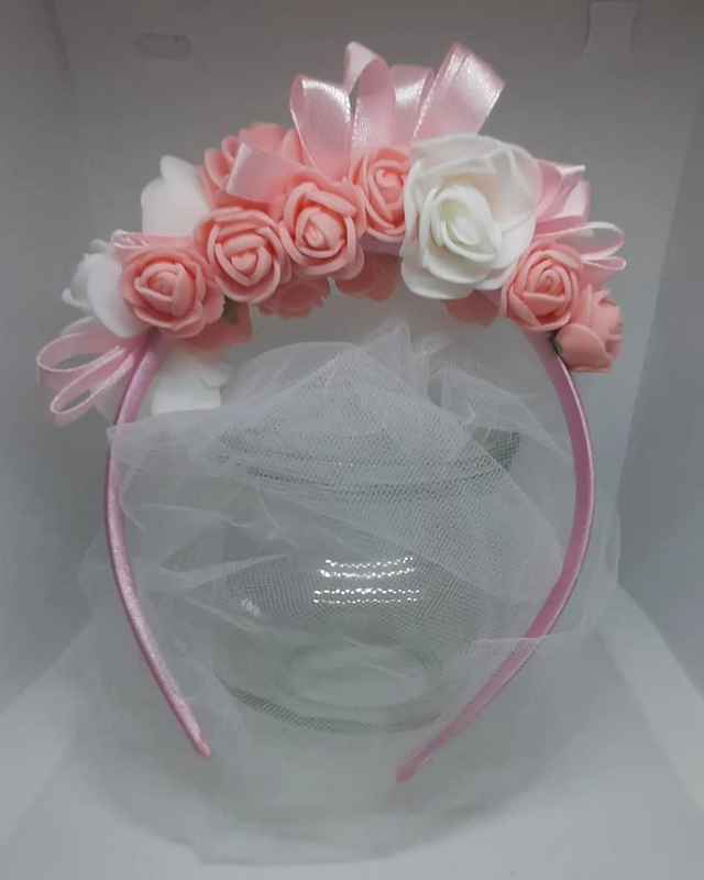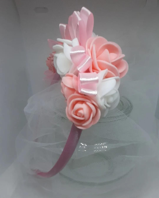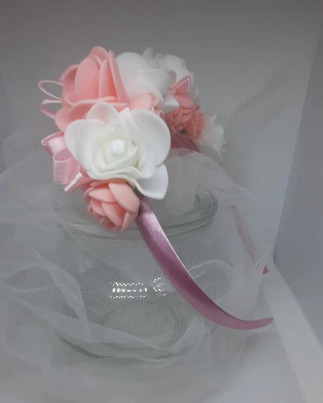 Serre-tête en satin rose avec des fleurs en mousse et des petits rubans en satin rose . Des roses blanches et des roses roses idéales pour une demoiselle d'honneur
