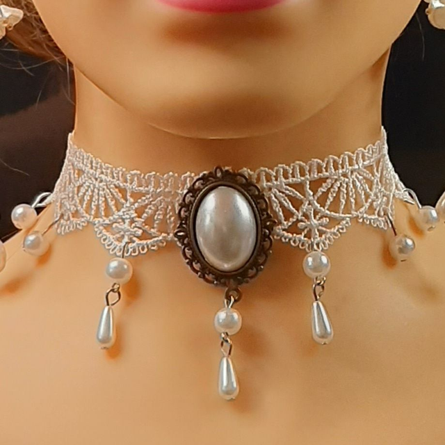 tour de cou en dentelle. 36 cm avec chaînette de rallonge orné de perles avec camé au centre
